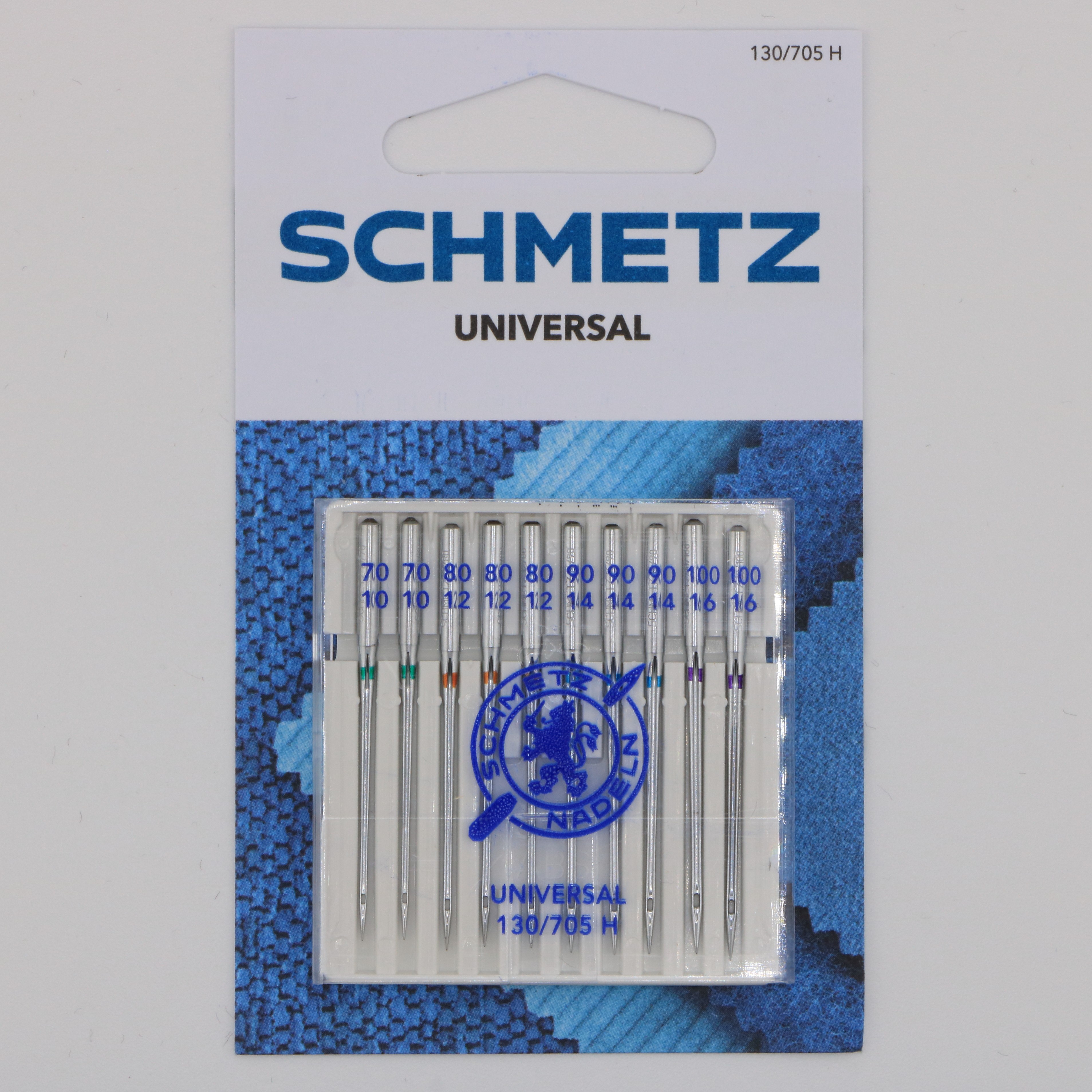 Assortiment d’aiguilles universelles Schmetz de tailles NM 70 à 100 (US 10 à 16), système 130/705 H‑HAx1. Compatibles avec toutes les machines à coudre familiales à talon plat. Pour une grande variété de tissus tissés : du voile de coton à la toile épaisse. Idéal pour celles et ceux qui veulent toujours avoir la bonne aiguille sous la main.