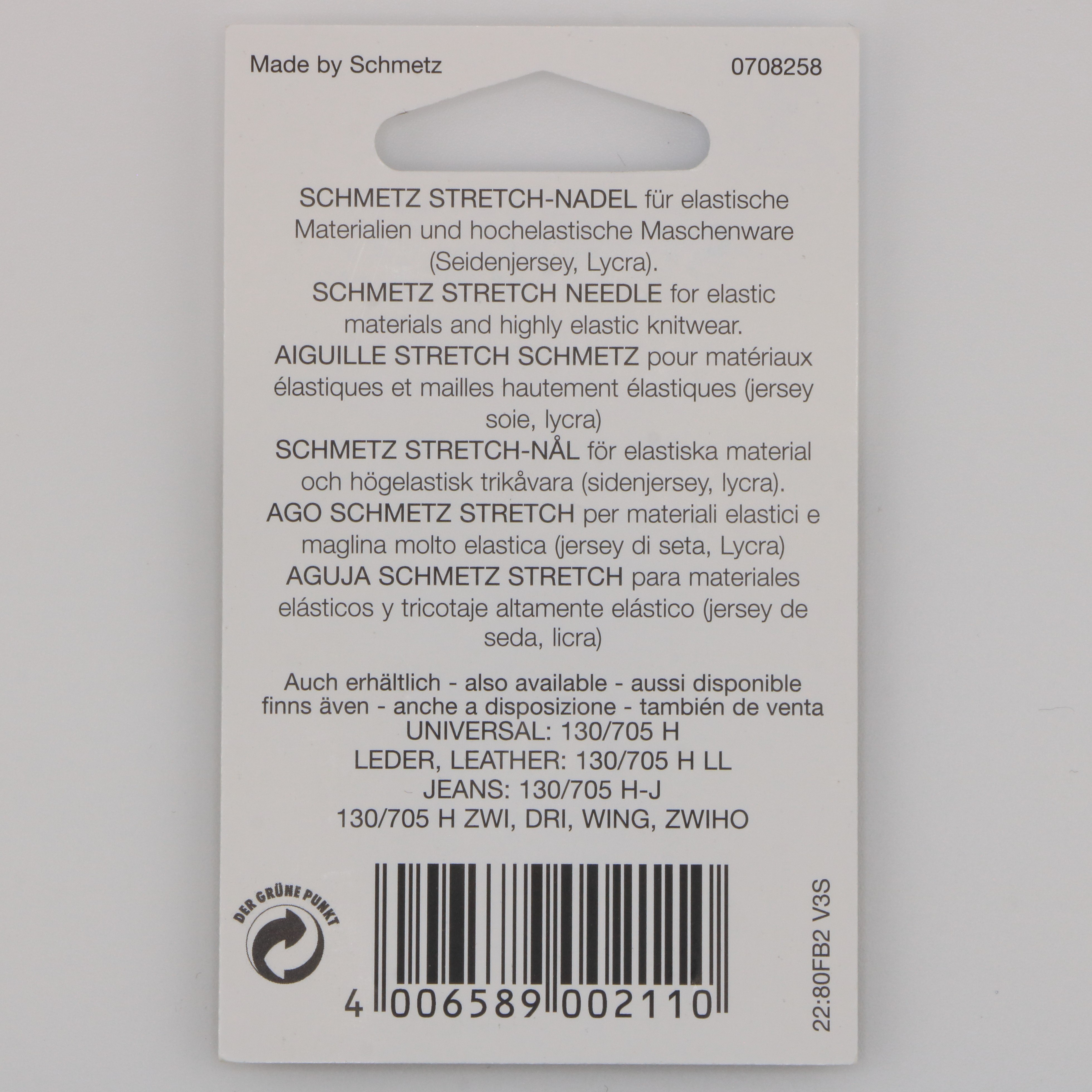 Aiguille Stretch de taille NM 90 (US 14), système 130/705 H-S, compatible avec toutes les machines à coudre familiales à talon plat. Conçue pour les tissus très extensibles et un peu épais comme le lycra gainant, le jersey technique ou les maillots de bain doublés. Idéale pour des coutures solides et souples, sans points sautés.