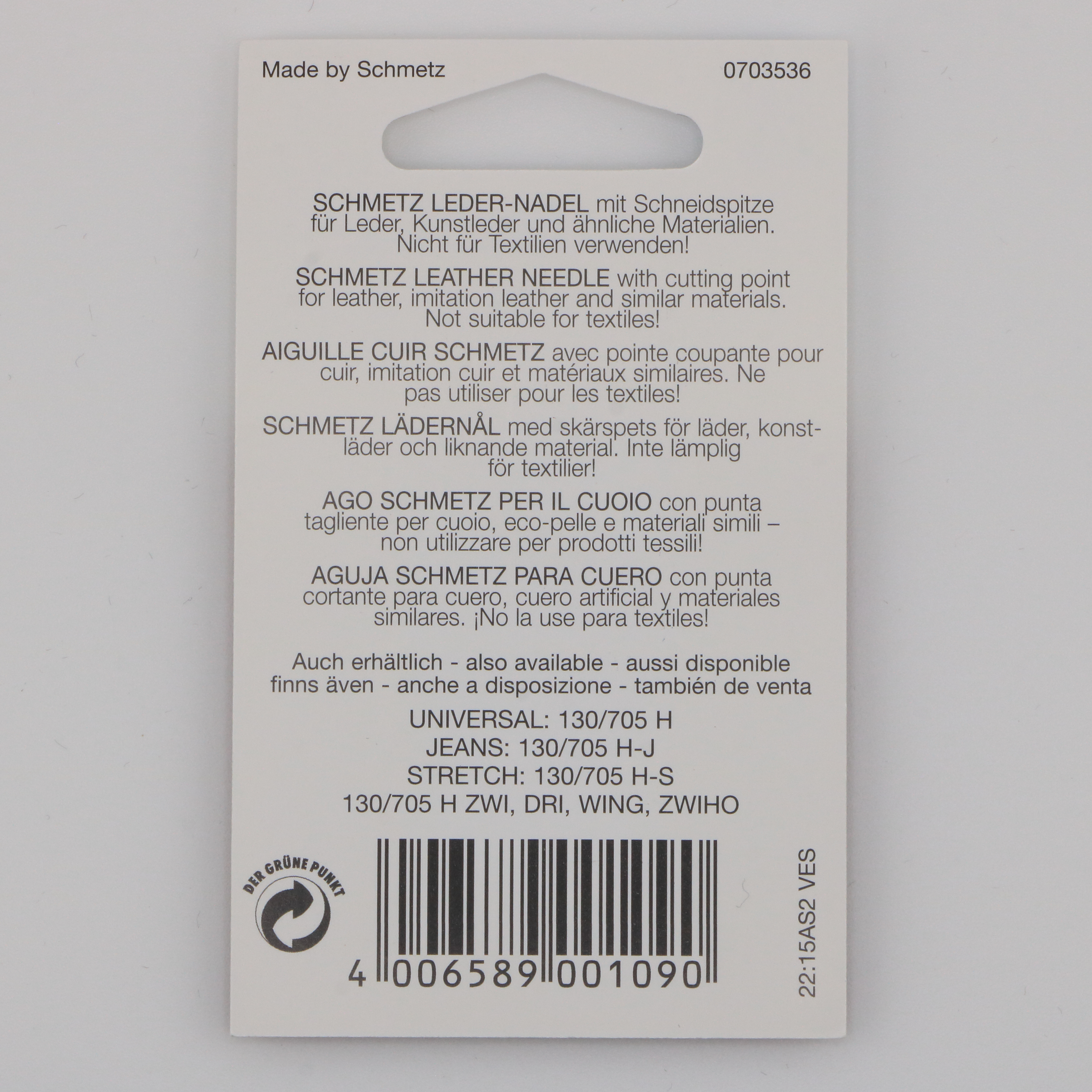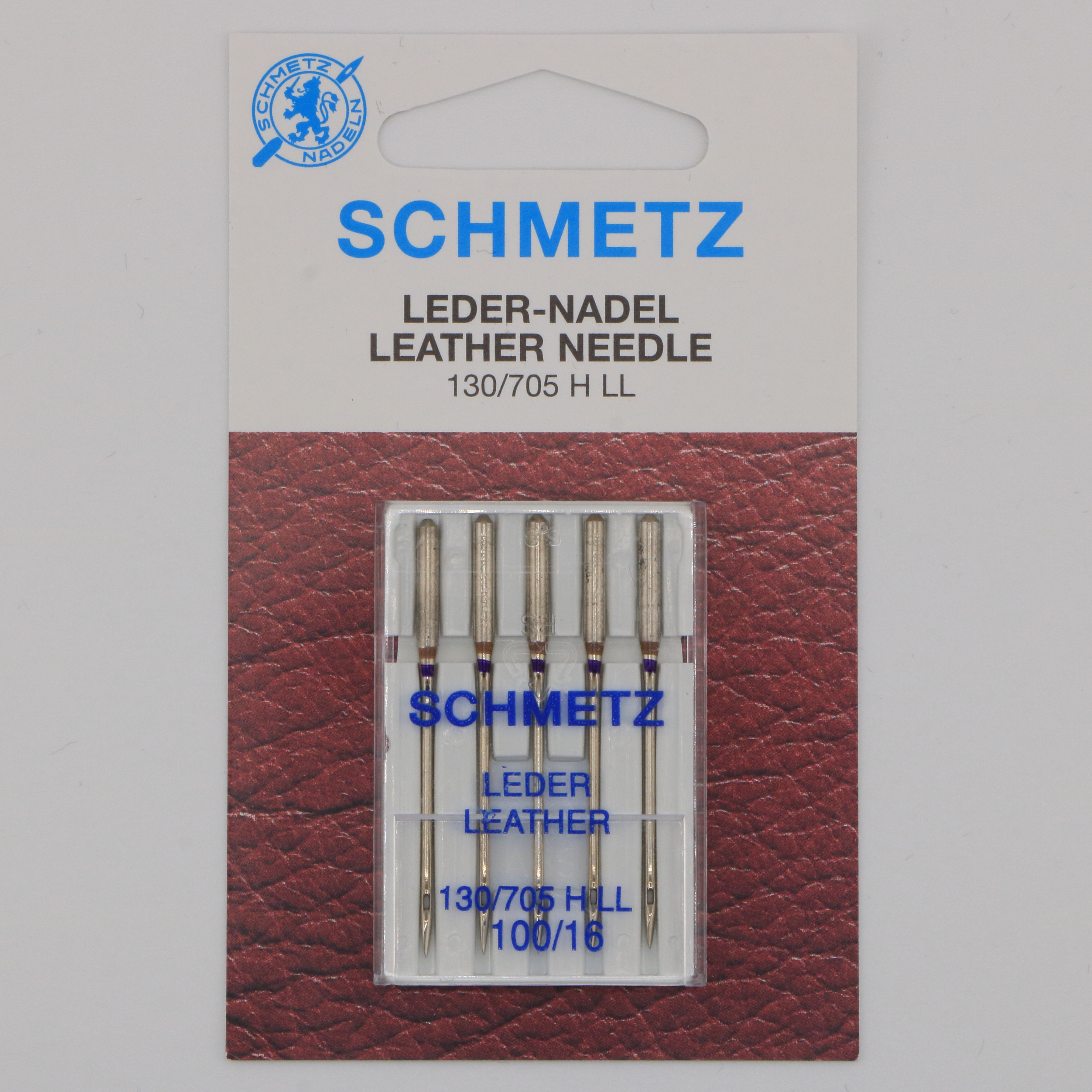 Aiguille cuir NM 100 (US 16), système 130/705 H LL, pour machines domestiques à talon plat. Sa pointe en lancette traverse les cuirs épais, les similis rigides et les matériaux denses sans les déchirer. L’arme idéale pour des coutures franches et nettes sur des supports costauds.