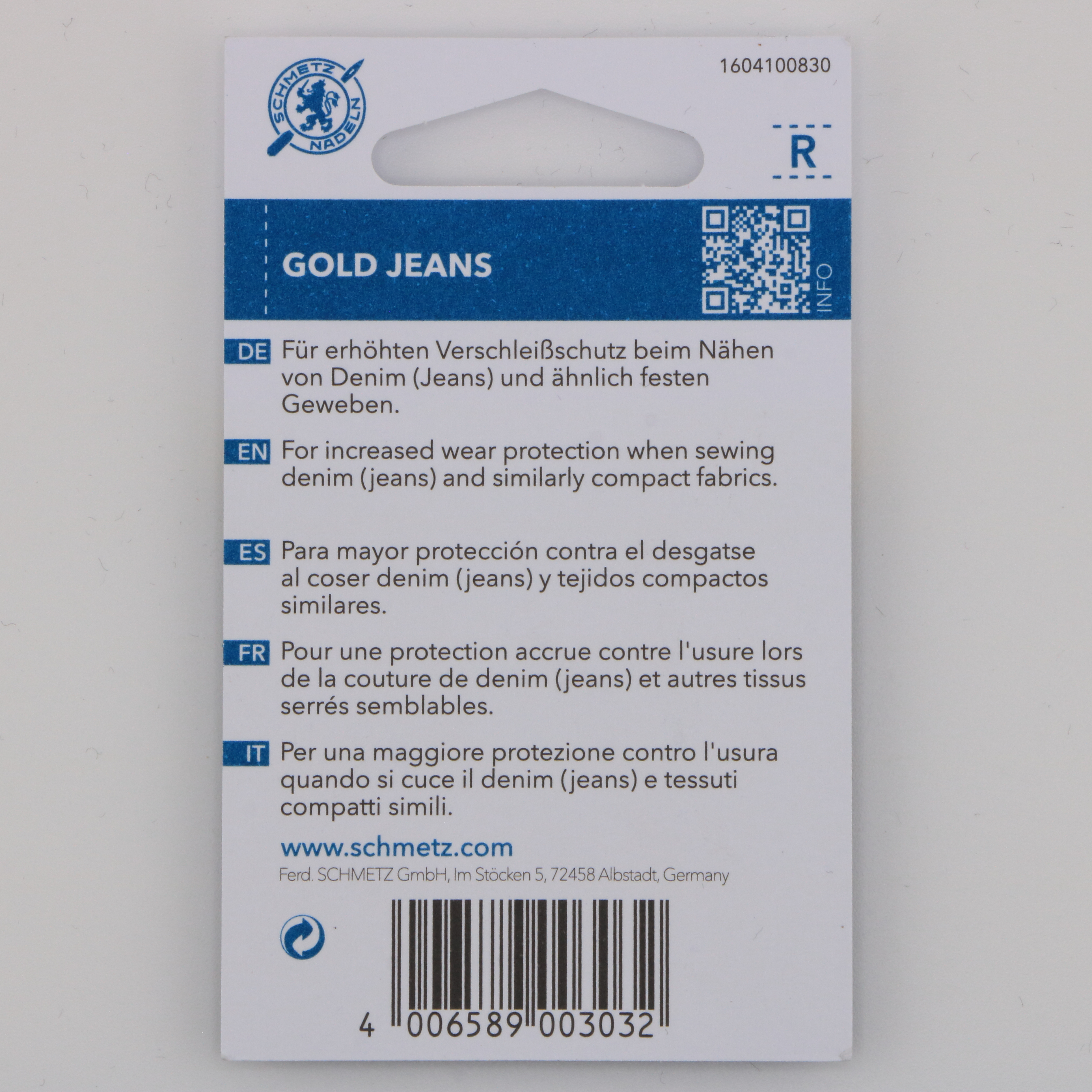 L’aiguille Schmetz Gold Jeans NM 90 est ta meilleure alliée pour coudre le denim, la gabardine ou les tissus épais tout en gardant une performance constante sur la durée. Grâce à son revêtement en nitrure de titane, elle glisse mieux, s’use moins vite, et résiste bien mieux à l’échauffement et aux frottements que les aiguilles standards.