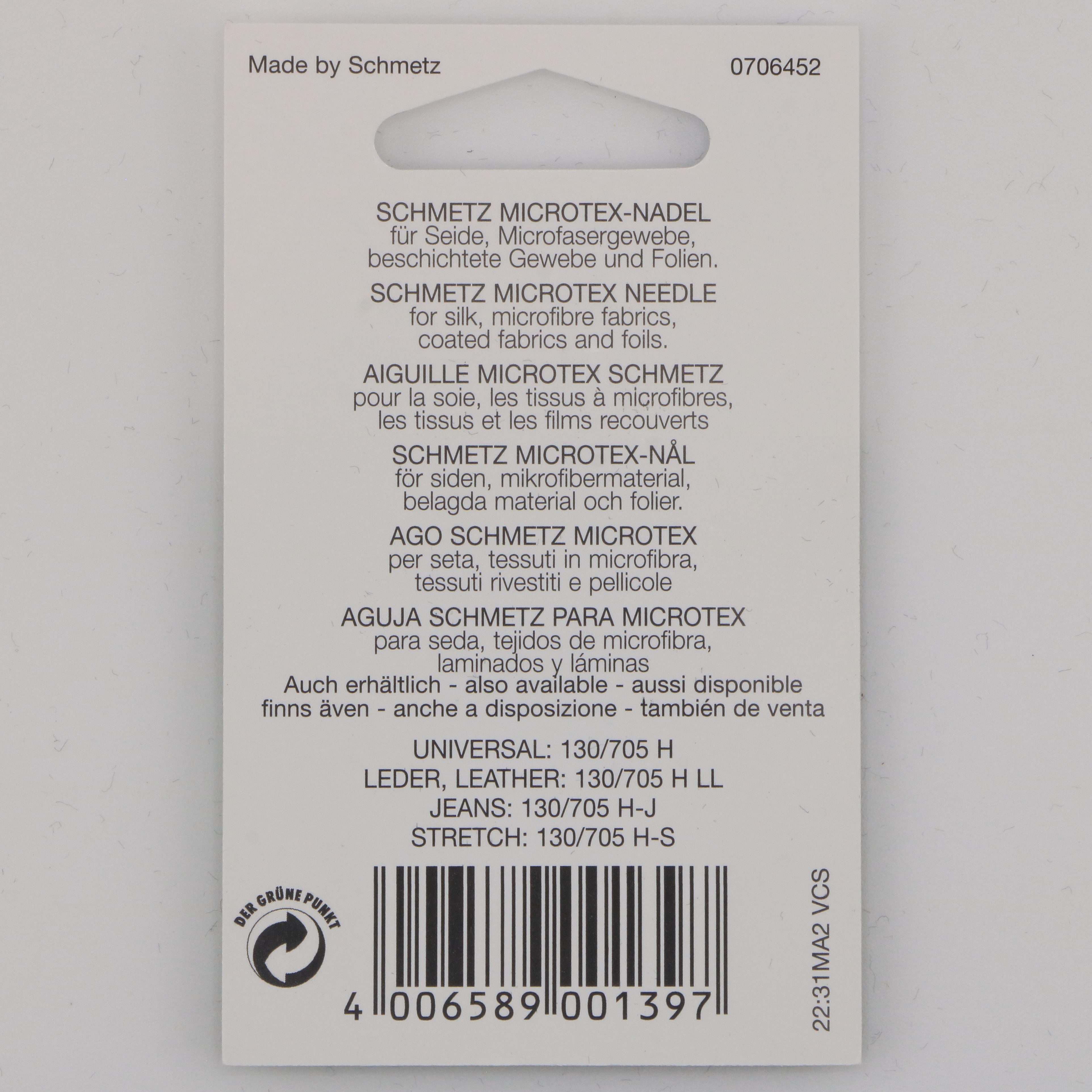 Aiguille Microtex NM 70, système 130/705 H-M, à pointe très fine et acérée. Idéale pour les tissus délicats, fins ou denses : soie, microfibres, tissus techniques, enduits fins… Elle assure une pénétration nette sans abîmer la matière.