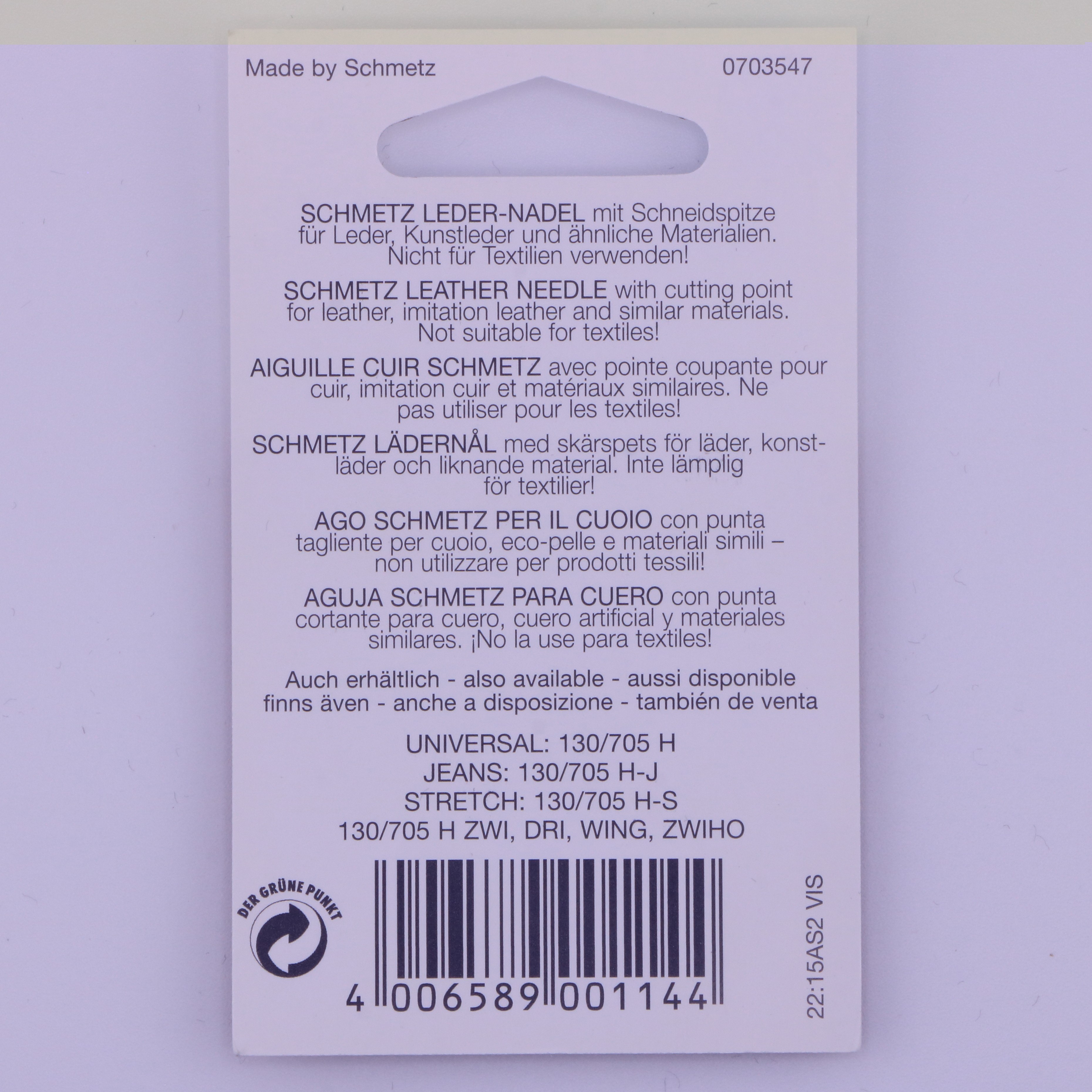 Aiguille cuir NM 100 (US 16), système 130/705 H LL, pour machines domestiques à talon plat. Sa pointe en lancette traverse les cuirs épais, les similis rigides et les matériaux denses sans les déchirer. L’arme idéale pour des coutures franches et nettes sur des supports costauds.