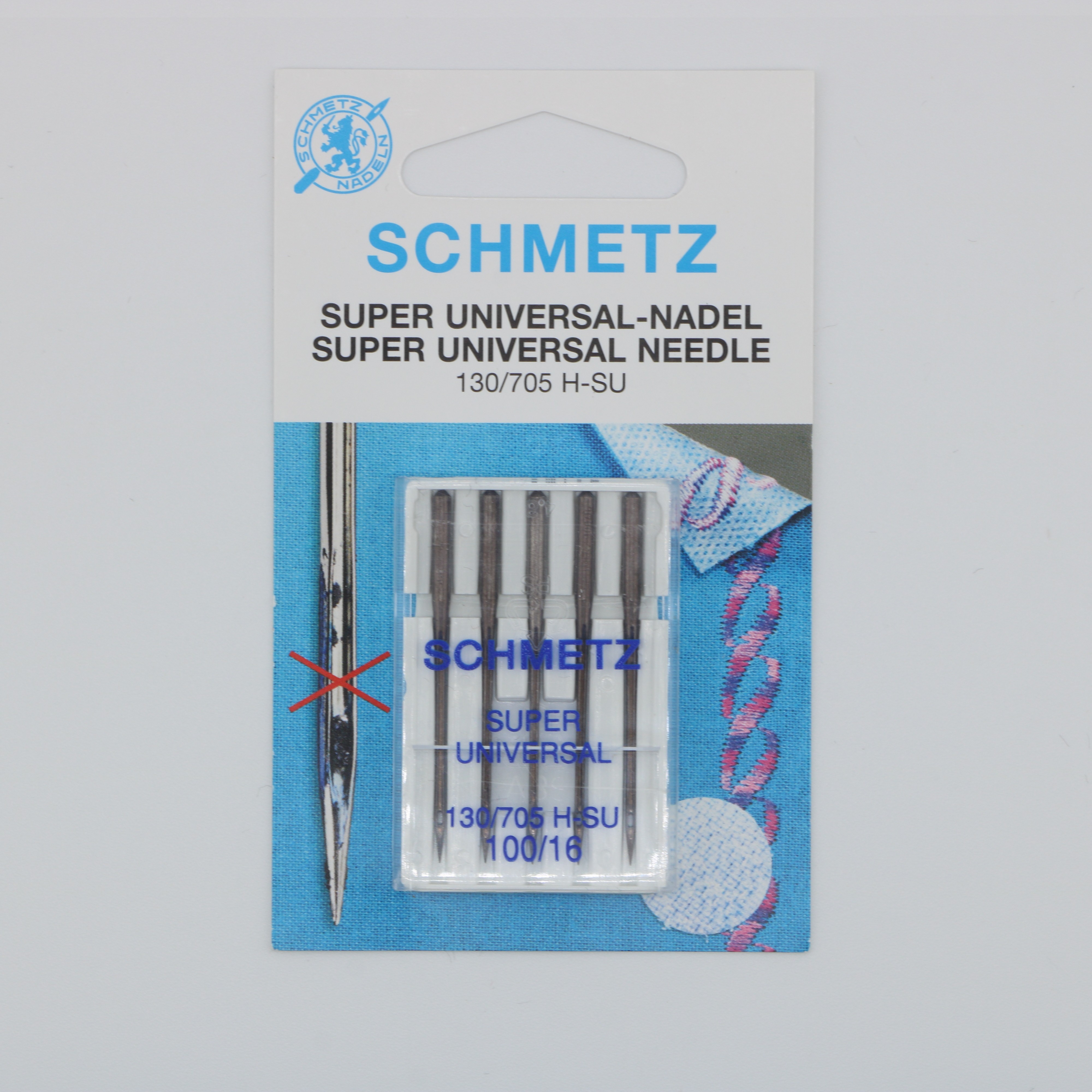 L’aiguille Schmetz Super Universelle NM 100 (130/705 SU) est conçue pour les matières difficiles à coudre, notamment celles qui ont tendance à accrocher à l’aiguille ou à encrasser la machine : plastique fin, tissus enduits, papiers hydrosolubles, et surtout velcro autocollant, redouté pour ses résidus de colle.