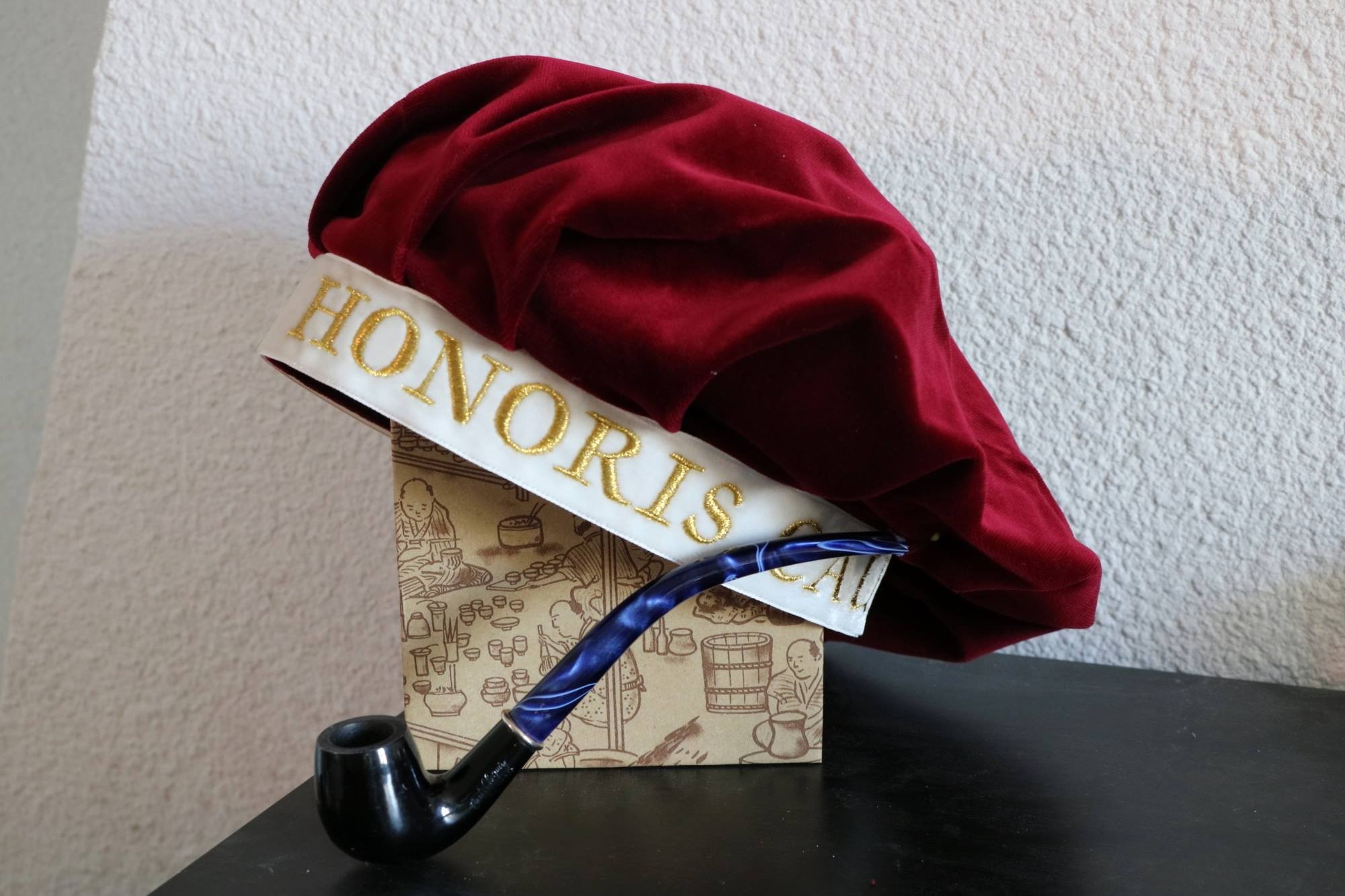 Veuillez décrire l’agencement souhaité des couleurs telles qu’elles seront disposées dans la faluche. - Par exemple, pour une faluche blanche et rouge, précisez si vous souhaitez le rouge à droite et le blanc à gauche ; - Pour une faluche à 4 couleurs bleu blanc rouge noir, spécifiez si vous désirez le bleu et le rouge à droite, le blanc en bas, le bleu et le noir à gauche, avec le noir en bas). Notez que l’agencement est toujours décrit depuis l’arrière du chapeau, face à soi.