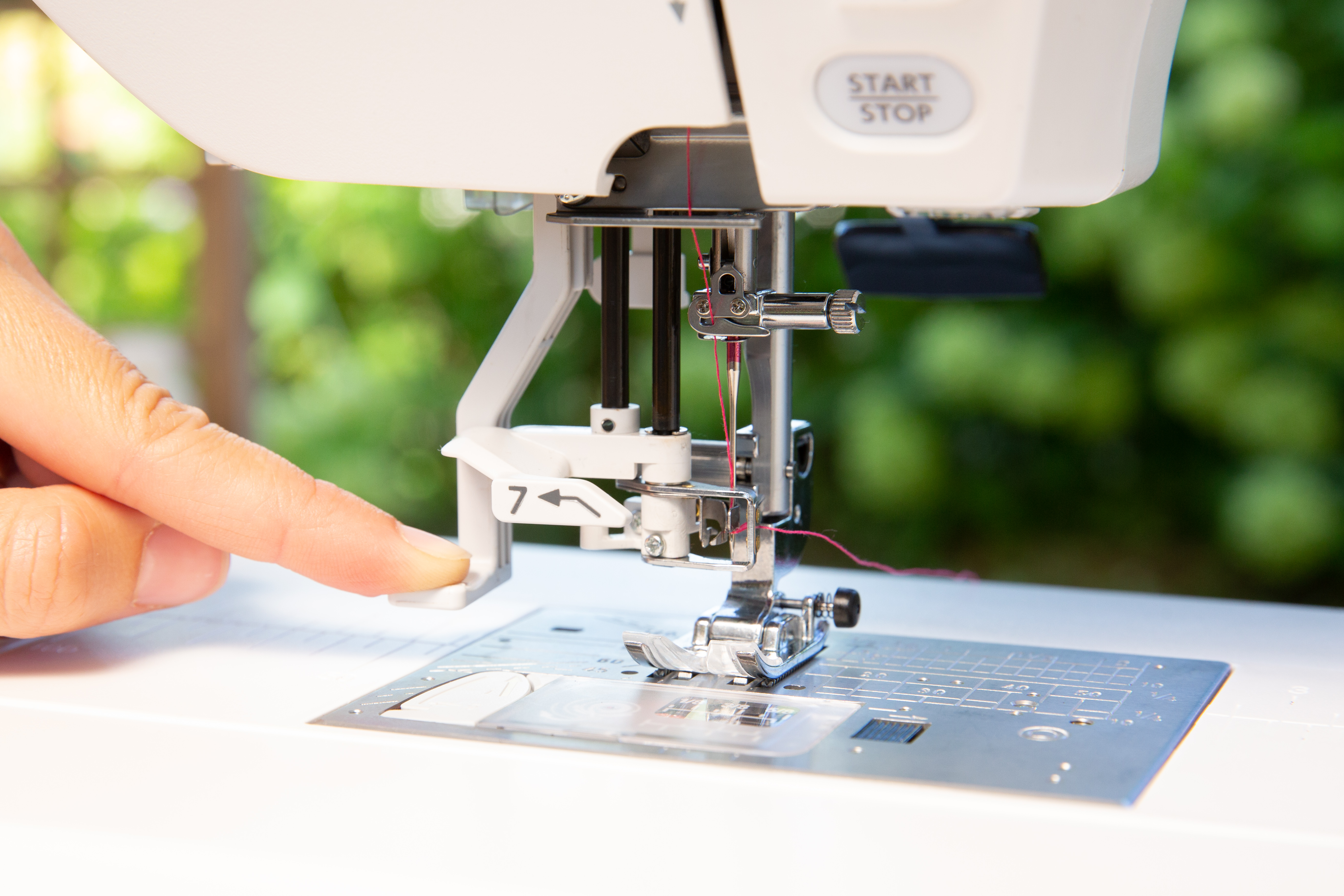 Bien que la machine dispose d'un enfile-aiguille automatique, beaucoup plus performant que celui de l'Elna eXperience 560, il reste important de lever le pied-de-biche avant d'enfiler la machine pour éviter tout accroc.
