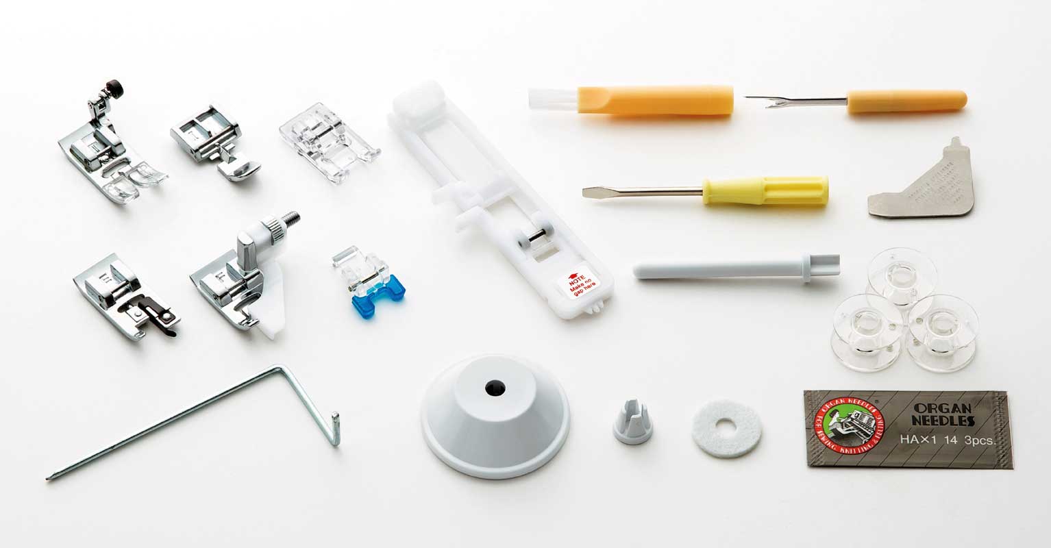 Accessoires inclus Tournevis (x2), Feutrine bobine, Brosse, Découd-vite, Canettes (x3), Guide matelassage, Arrêtoirs bobines (x2), Porte-bobine supplémentaire (x1), Assortiment d'aiguilles, Capot rigide