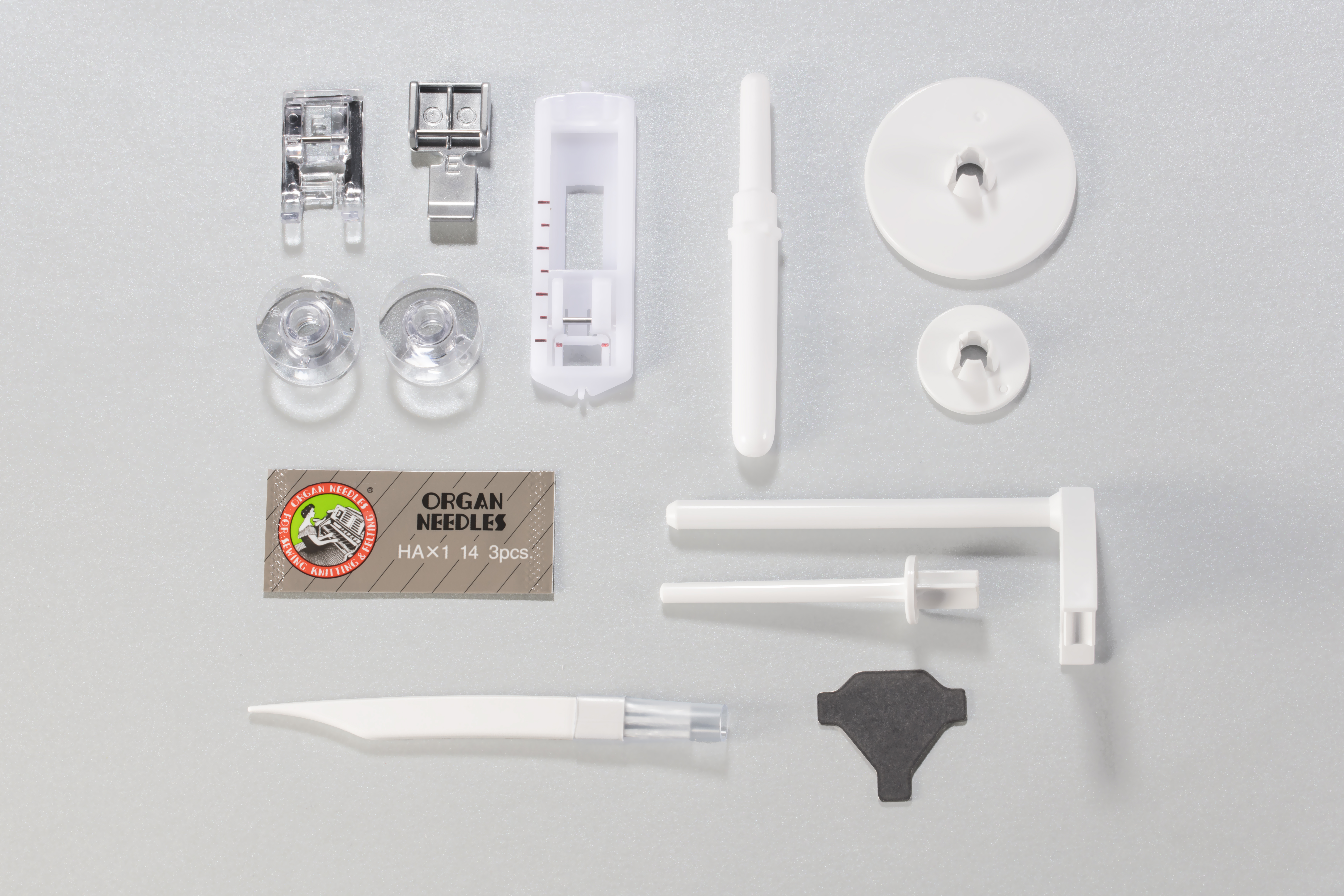 Accessoires inclus Canettes (x3), Assortiment d'aiguilles, Pinceau de nettoyage, Découd-vite, Tournevis, Tige porte-bobine supplémentaire, Disque fixe-bobine (petit x1 et large x1), Pédale, Câble d'alimentation, Housse de protection