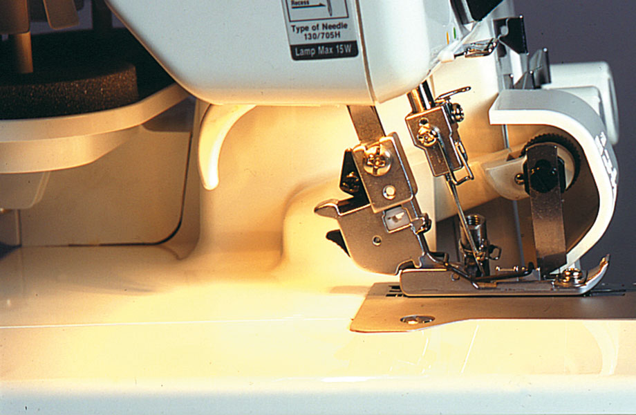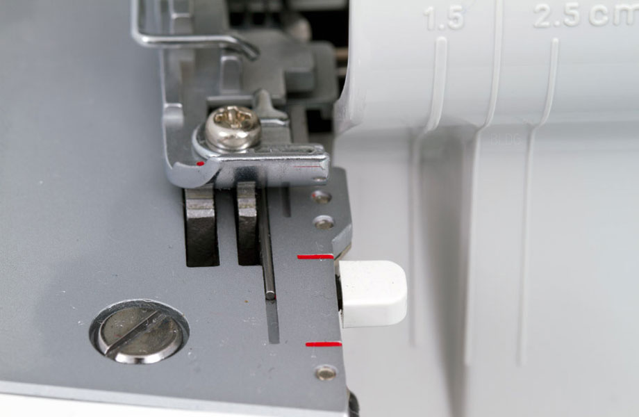 Grâce à l’aiguille gauche, elle permet de réaliser des surjets de 6 mm, tandis que l’aiguille droite produit du 4 mm. Elle excelle également dans les roulottés 2 mm et permet le flatlock et surjet en 2 fils.
